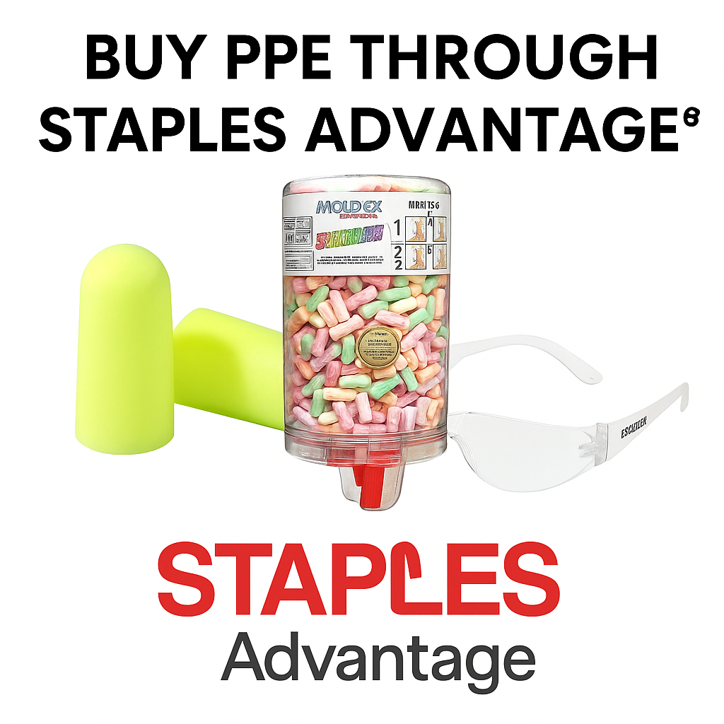 Earplugs, safety glasses, gloves and more. Just click on the button below and you will be directed to the Staples Advantage site with a list of select PPE products selected specifically for you
